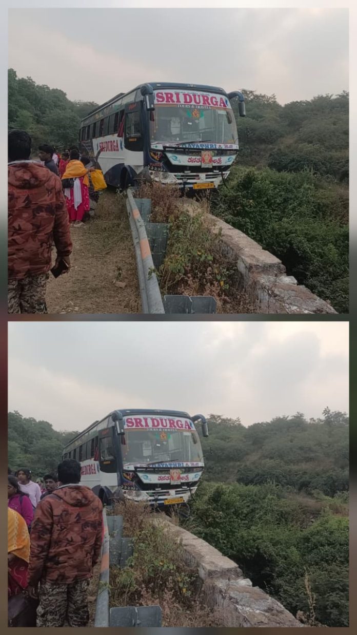 కాక‌తీయ‌, ప్రకాశం : ప్రకాశం జిల్లా దోర్నాల ఫారెస్ట్ చెక్‌పోస్ట్‌కు కూతవేటు దూరంలో శనివారం శ్రీశైలం వెళ్తున్న టూరిస్ట్ బస్సు అదుపుతప్పి రోడ్డు డివైడర్ మధ్యలో దూసుకెళ్లింది. ఈ ఘటనతో క్షణకాలం ఉద్రిక్తత నెలకొనగా, అదృష్టవశాత్తు ఎటువంటి ప్రాణనష్టం జరగలేదు. బస్సులో పలువురు ప్రయాణికులు ఉండటంతో ప్రమాదం చోటుచేసుకుంటే తీవ్ర పరిణామాలు ఎదురయ్యే పరిస్థితి ఏర్పడింది. అయితే డ్రైవర్ అప్రమత్తతతో పెనుప్రమాదం తప్పినట్లు స్థానికులు తెలిపారు. ప్రమాదం జరిగిన వెంటనే రోడ్డుపై ట్రాఫిక్‌కు అంతరాయం ఏర్పడింది. సమాచారం అందుకున్న దోర్నాల పోలీసులు వెంటనే సంఘటనా స్థలానికి చేరుకుని ట్రాఫిక్‌ నిలిచిపోకుండా చర్యలు చేపట్టారు. బస్సును రోడ్డుపై నుంచి తొలగించి వాహనాల రాకపోకలను సజావుగా కొనసాగించారు. ఈ ఘటనతో ప్రయాణికులు ఊపిరి పీల్చుకోగా, శ్రీశైలం మార్గంలో వాహనదారులు అప్రమత్తంగా ఉండాలని పోలీసులు సూచించారు.