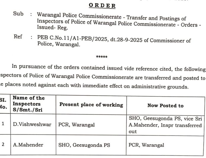వరంగల్ పోలీస్ కమీషనరేట్ పరిధిలో ఇద్దరు ఇన్స్పెక్టర్ల బదిలీ