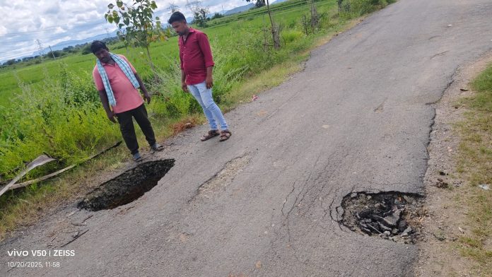 కాకతీయ, జూలూరుపాడు : మండలంలోని చింతలతండా, లైన్ తండా గ్రామాల మధ్య ఉన్న ప్రధాన రహదారి మృత్యు కూపంగా మారింది. ముఖ్యంగా నడిరోడ్డుపై ఏర్పడిన భారీ గొయ్యి కారణంగా నిత్యం ప్రమాదాలు పొంచి ఉన్నాయని, వాహనాలు బోల్తా పడే ప్రమాదం ఉందని స్థానికులు ఆందోళన చెందుతున్నారు. దీంతో భారీ గొయ్యి లో స్థానికులు కొన్ని చెట్ల కొమ్మలను, బస్తా సంచులు ప్రమాద సూచిక బోర్డులాగా పెట్టారు. ఈ దుస్థితితో అధికారుల నిర్లక్ష్యంపై స్థానికులు ఆగ్రహం వ్యక్తం చేస్తున్నారు. గుంత వల్ల ప్రయాణికులు తమ ప్రాణాలు అరచేతిలో పెట్టుకుని ప్రయాణిస్తున్నారని ప్రజలు వాపోతున్నారు. ఇప్పటికైనా అధికారులు, పాలకులు స్పందించి భారీ గుంతను పూడ్చాలని స్థానికులు కోరుతున్నారు.