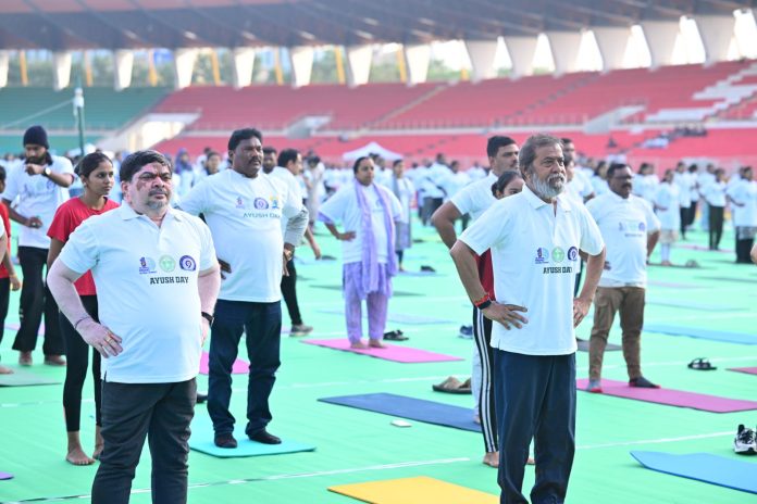 కాక‌తీయ‌, తెలంగాణ బ్యూరో: తెలంగాణలో ప్రభుత్వం చేపట్టిన ప్రజాపాలన – ప్రగతి ప్రణాళికలో భాగంగా నిర్వహిస్తున్న పలు కార్యక్రమాలు అట్టహాసంగా కొనసాగుతున్నాయి. అందులో భాగంగా మెరుగైన తెలంగాణ కోసం ఆరోగ్య వారోత్సవాలు చేపట్టారు. నేడు ప్రపంచ హోమియోపతి దినోత్సవాన్ని పురస్కరించుకుని పలుచోట్ల యోగా వేడుకలు నిర్వహించారు. ఈ యోగా కార్యక్రమాల్లో పలువురు ప్రజాప్రతినిధులు పాల్గొని ప్రజలకు ఆదర్శంగా నిలిచారు. కాగా.. హైద‌రాబాద్ గ‌చ్చిబౌలి స్టేడియంలో ఆరోగ్య వారోత్సవాలు ఘనంగా జరిగాయి. యోగా వేడుకల్లో ఆరోగ్యశాఖ మంత్రి దామోదర రాజ నరసింహతో కలిసి మంత్రి పొన్నం ప్రభాకర్‌ పాల్గొన్నారు. ఆరోగ్యవంతమైన తెలంగాణ నిర్మాణంలో ప్రతి ఒక్కరు భాగస్వాములు కావాలని మంత్రి దామోదర పిలుపునిచ్చారు. భారత్ ప్రపంచానికి అందించిన గొప్ప విద్య యోగా అని ఆయన తెలిపారు. దీనిని ప్రోత్సహించేందుకు బీఎన్ వైఎస్ కోర్స్​తో పాటు పీజీ కోర్సులను ప్రారంభించేందుకు చర్యలు తీసుకుంటున్నట్లు వెల్లడించారు. యోగా, నేచురోపతి, హోమియోపతి వంటి ఆయుష్ విధానాలను బలోపేతం చేసి ప్రజలకు సమగ్ర ఆరోగ్య సేవలను అందిస్తున్నామని చెప్పారు. ఈ కార్యక్రమానికి హెల్త్ సెక్రటరీ క్రిస్టినా సహా పలువురు అధికారులు హాజరయ్యారు. మంత్రులు, అధికారులు యోగ ఆసనాలు వేసి ఆకట్టుకున్నారు.