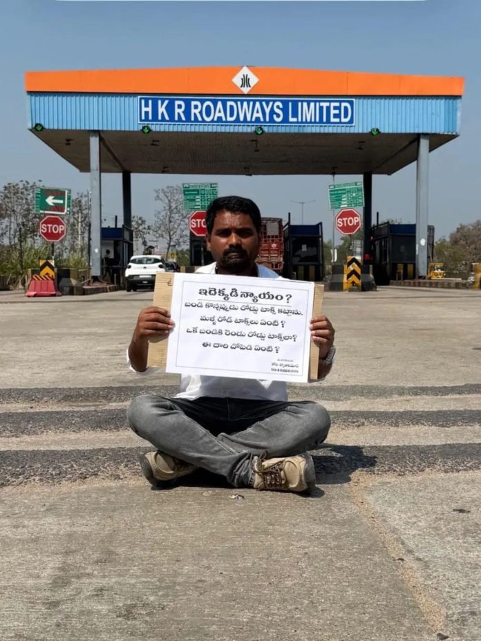 ఒకే వాహనానికి రెండుసార్లు పన్ను విధించడం దారి దోపిడీతో సమానమని పేర్కొంటూ, టోల్ ప్లాజా సమీపంలో రోడ్డుపై బైఠాయించి నిరసనకు దిగాడు. దీంతో వాహనాలు నిలిచిపోవడంతో రహదారిపై రద్దీ నెలకొంది.